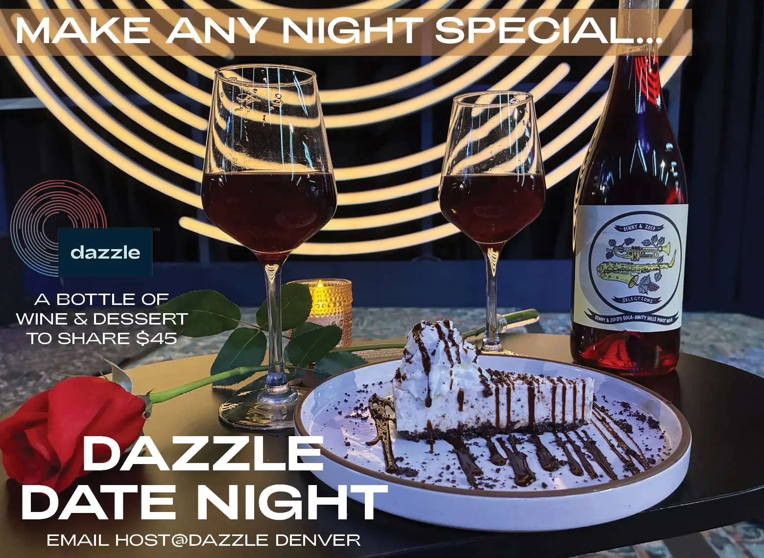 Email host@dazzledenver.com to add the Date Night Package to your evening. (Show tickets not included).